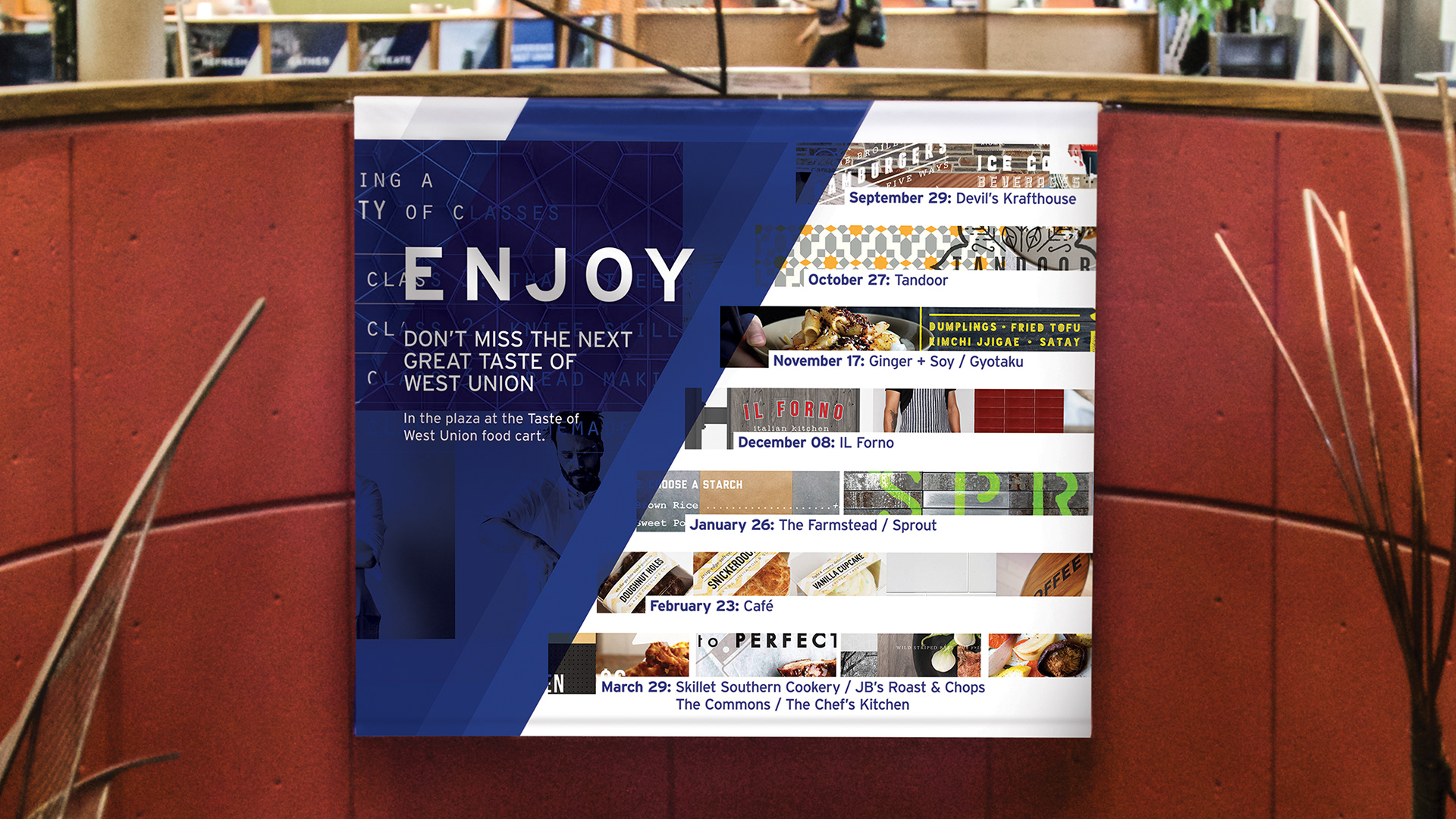 West Union, located within the Campus Center at Duke University, is a dynamic hub housing 13 unique restaurants, meeting spaces, workspaces, cooking class areas, and more. As the heart of campus life, West Union embodies the energy and spirit of Duke University—a vibrancy that the campaign materials needed to reflect. To achieve this, REVERED was hired to lead the effort.